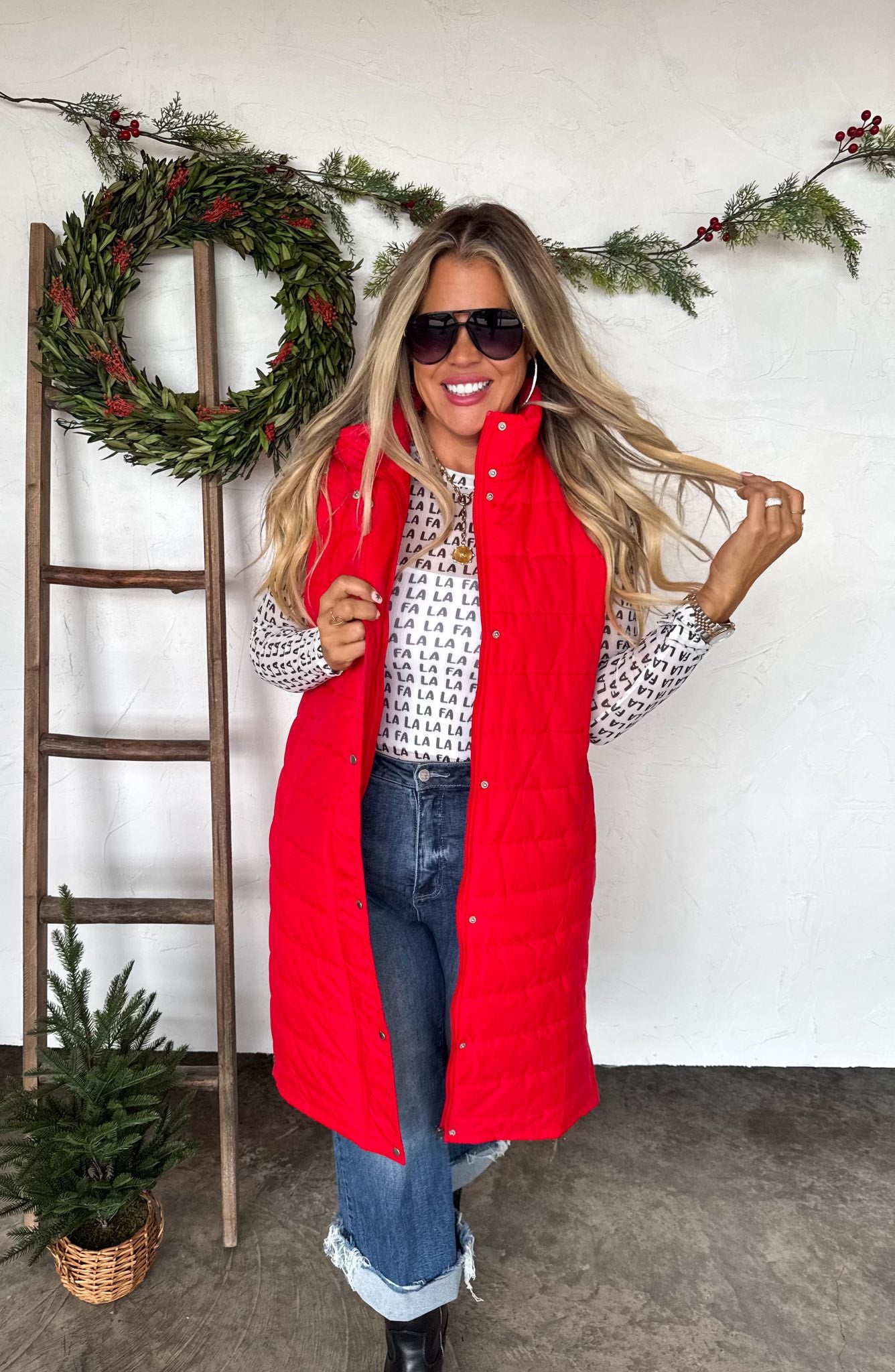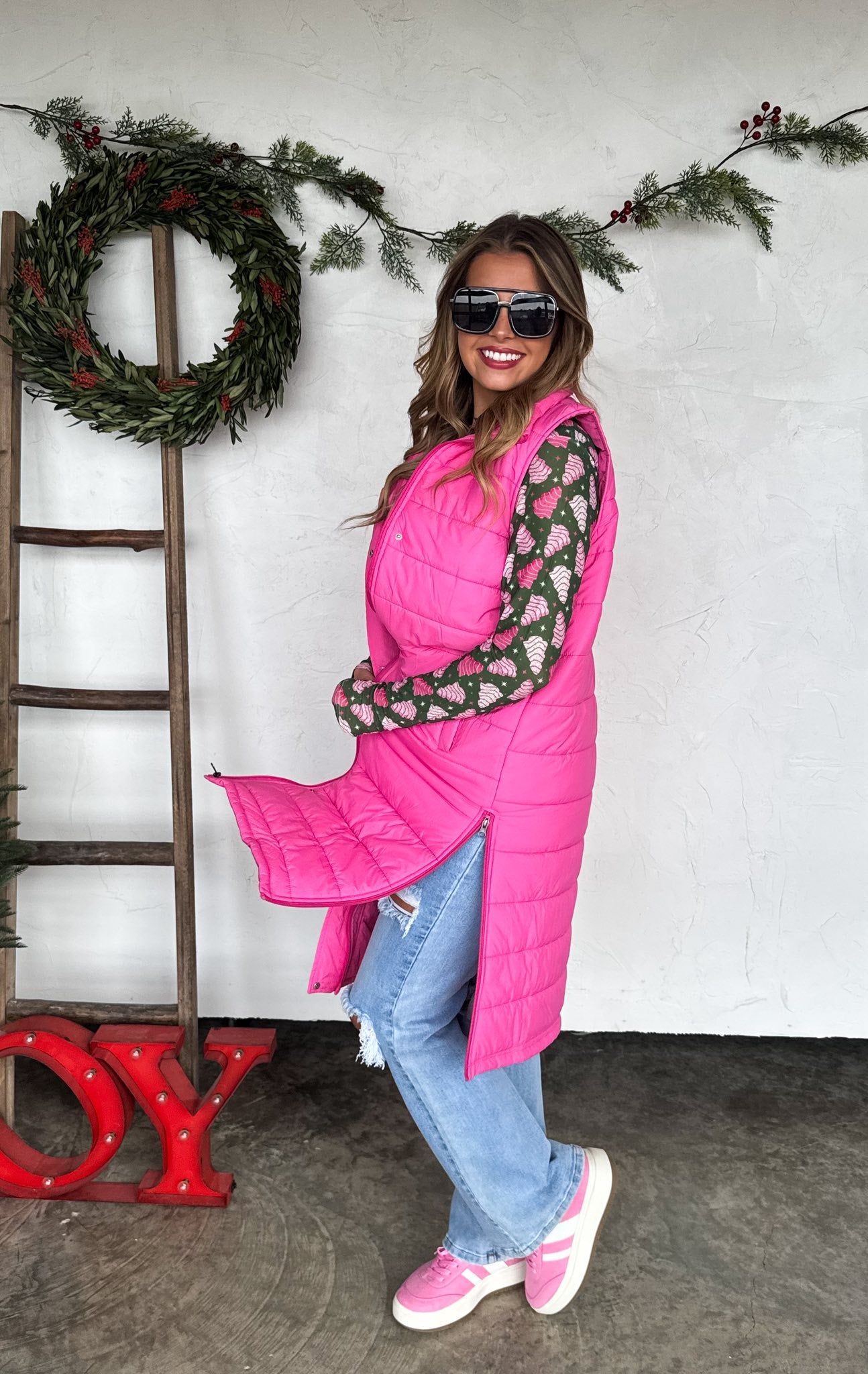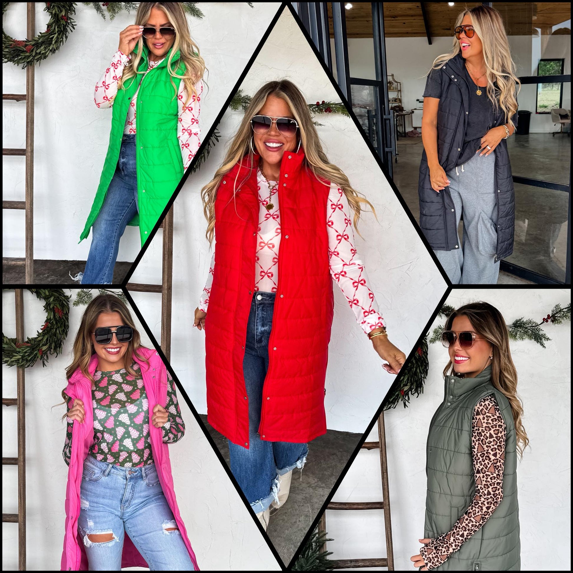 Stay warm and stylish this winter with the CUTEST LONG PUFFER VEST. Features snap buttons, ZIPPER and side pockets. Even the sides have a working zipper detail!